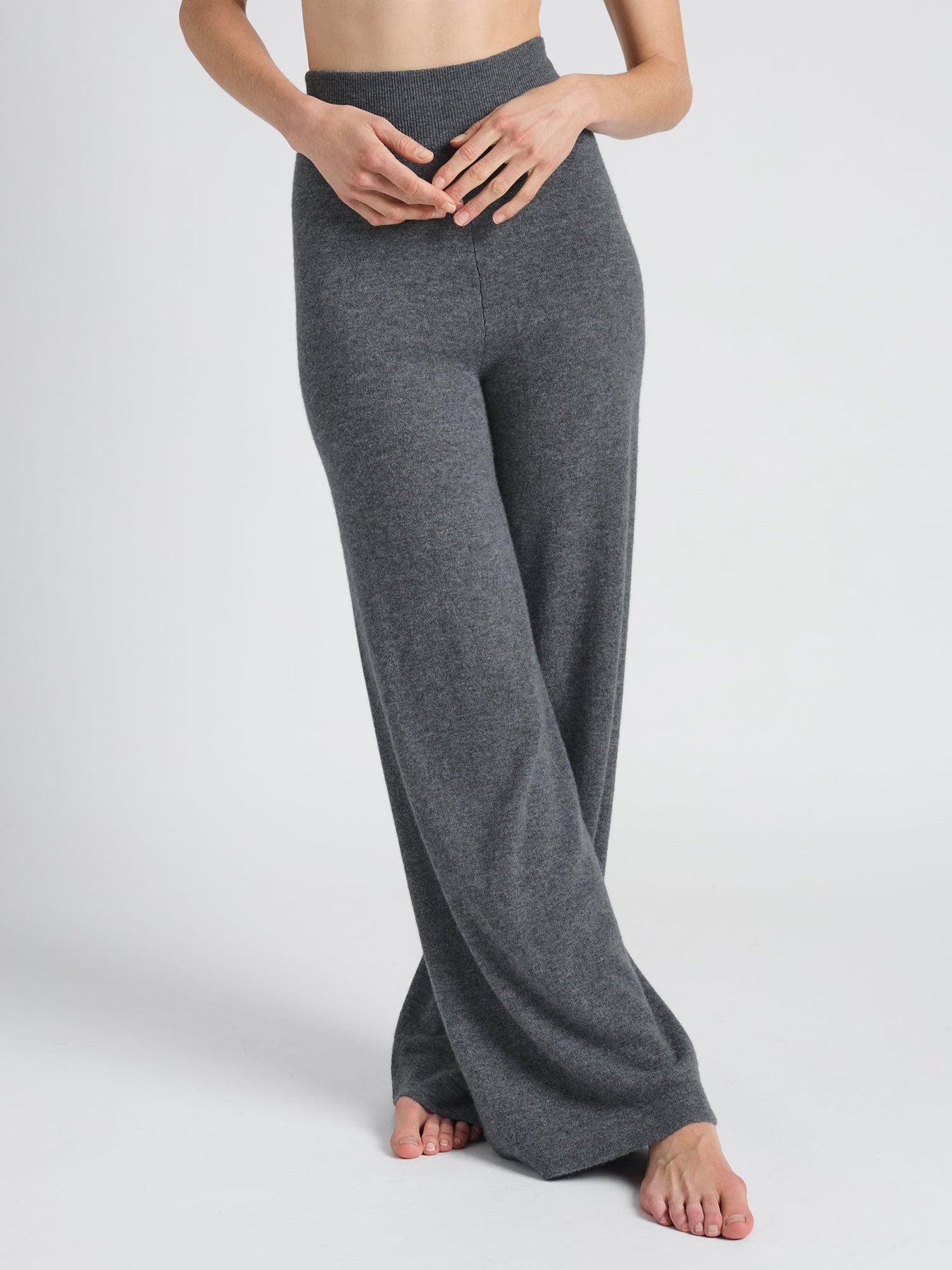 Wide-legged pants with ribbed waistband. 100% pure cashmere.