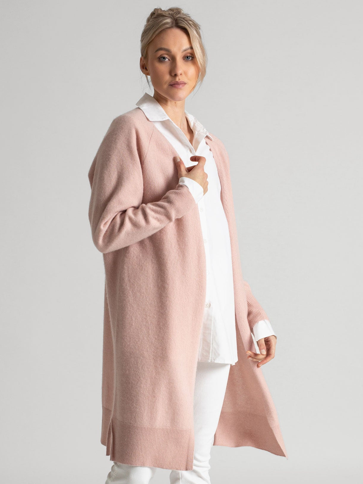 Cashmere cardigan "Linnea" in 100% pure cashmere, natural, light, long. Scandinavian design by Kashmina. Color: Rose Glow.