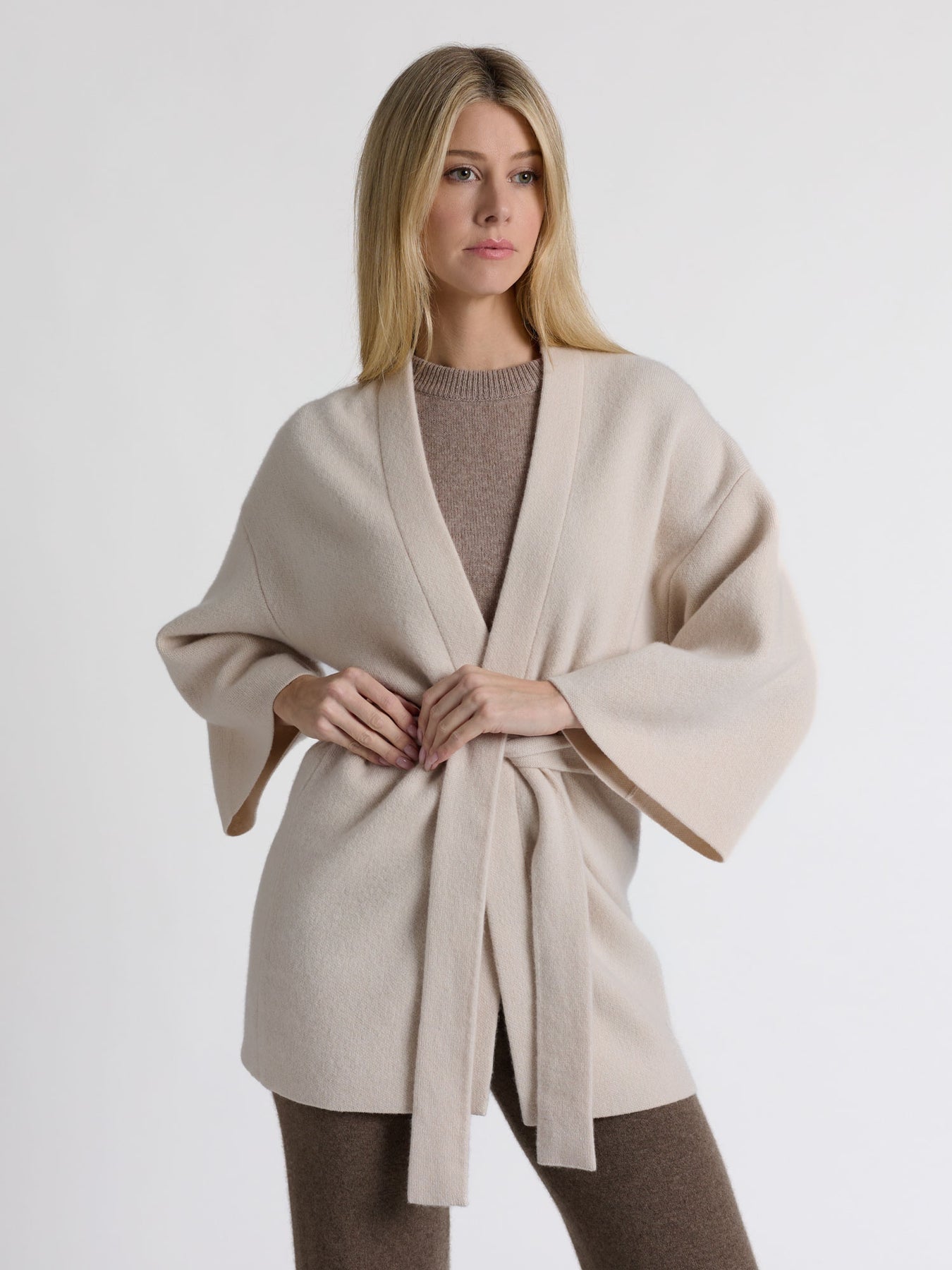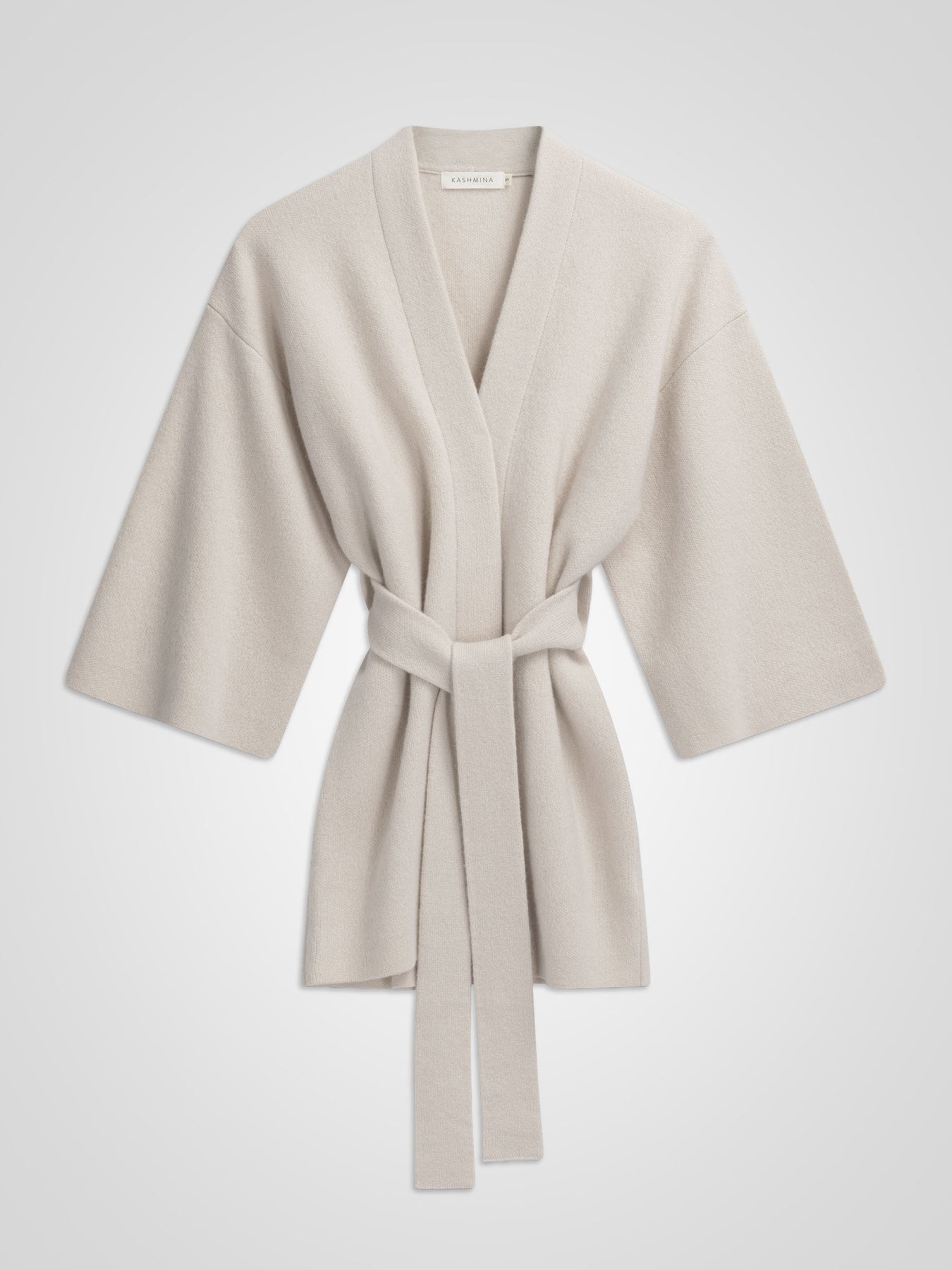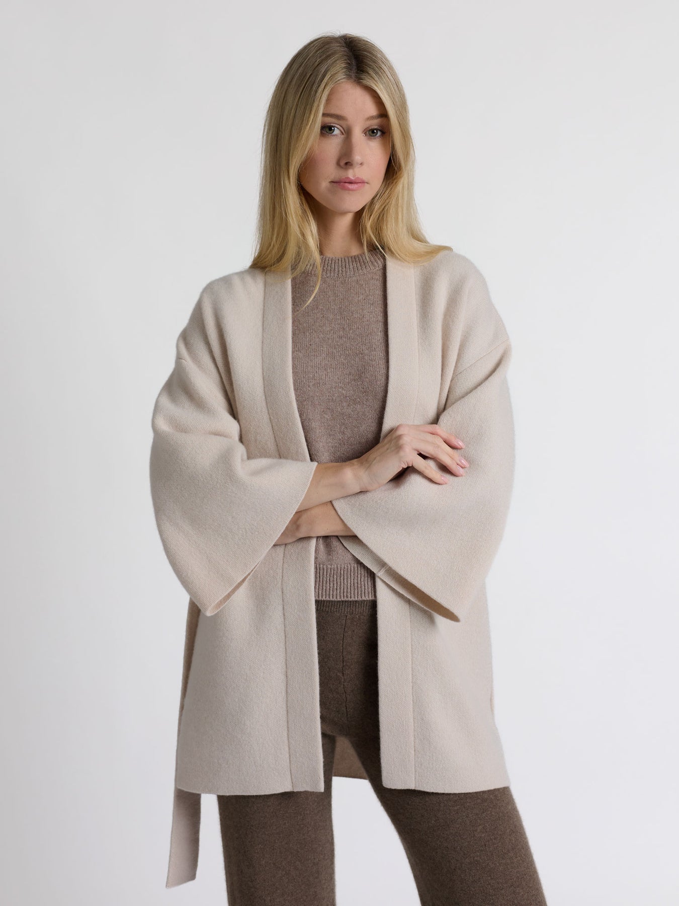 "Vera" is a cardigan in exclusive jacquard (double-sided) cashmere quality – made from 100% pure cashmere. Vera has a modern and flattering silhouette with wide sleeves and a beautiful tubular belt, giving it a minimalist and sophisticated look.