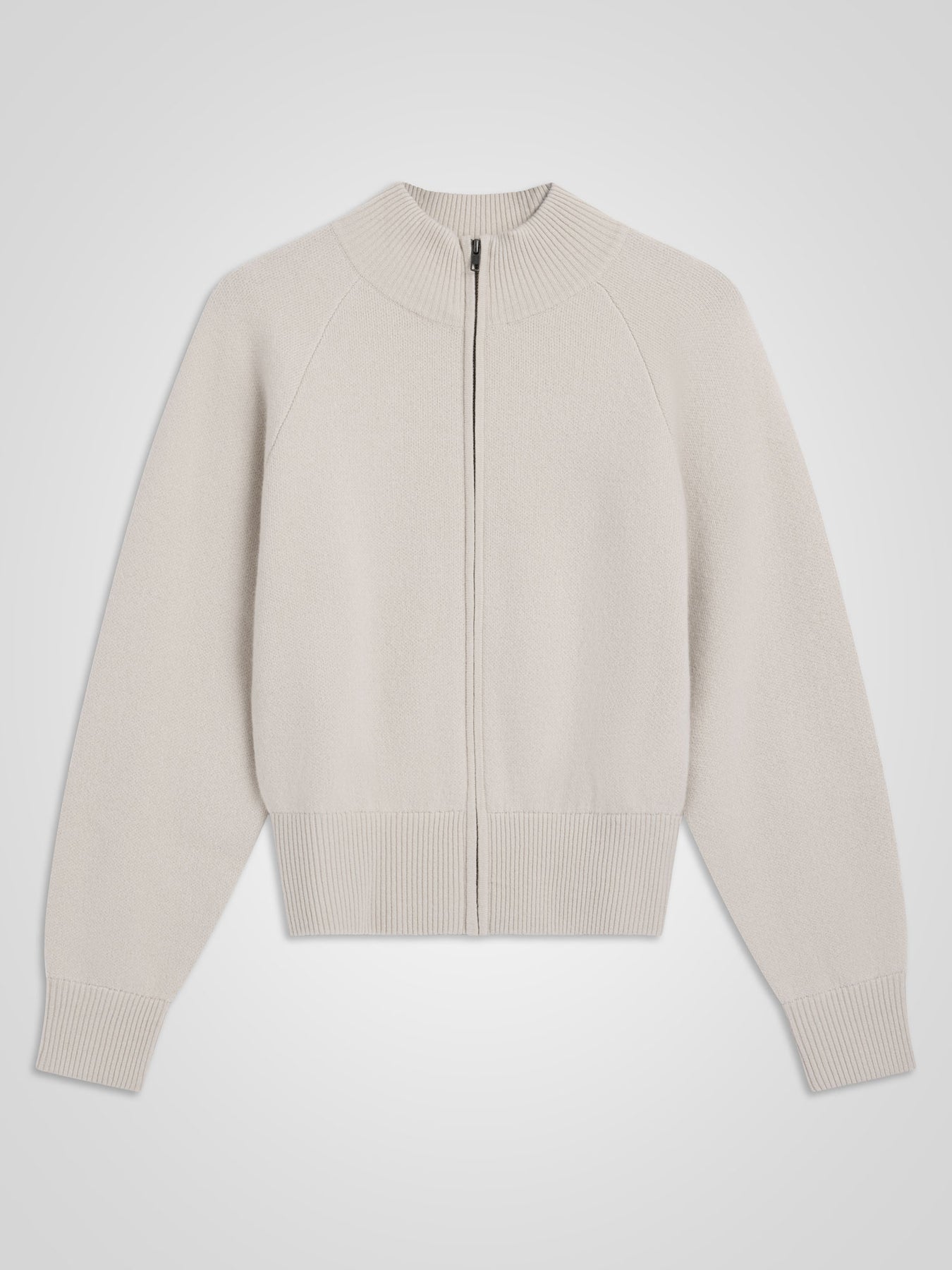 Oline is a beautiful cashmere jacket with zip made in an an exclusive jacquard quality. Made from 100% pure cashmere with rib-knit details.